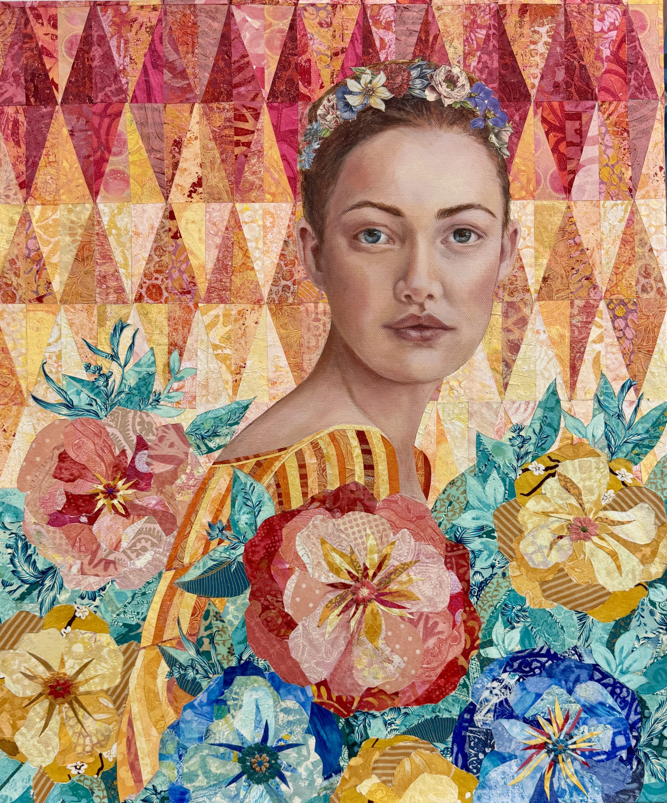“Bloom”. A 20 x 24 x 1.5 canvas mixed media painting. Acrylic portrait collaged with fabric, mono prints, and handmade papers