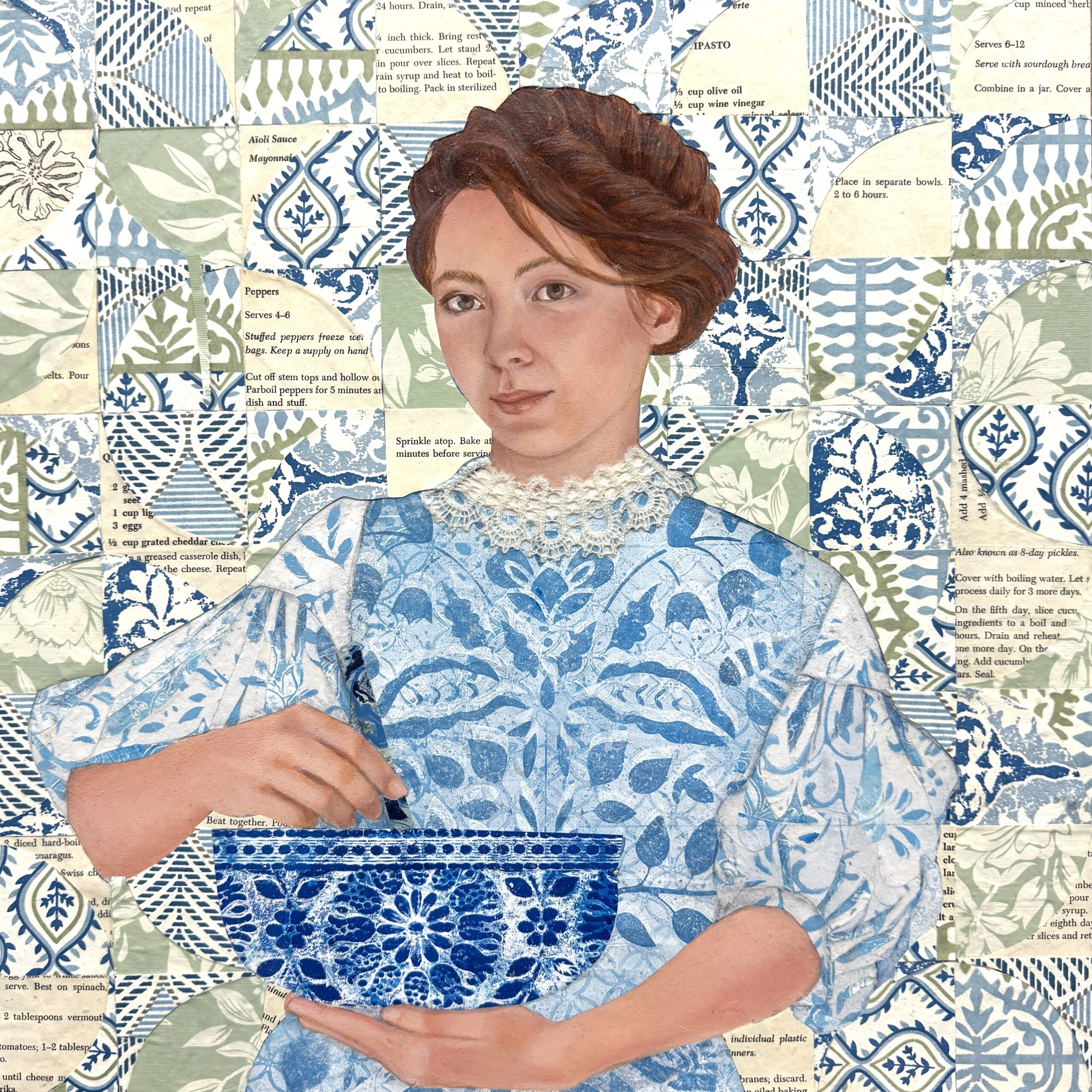 “Whisked Away”. A 16 x 16 x 1 canvas mixed media painting on wood cradle board.  Acrylic portrait  collaged with fabric, mono prints, and handmade papers